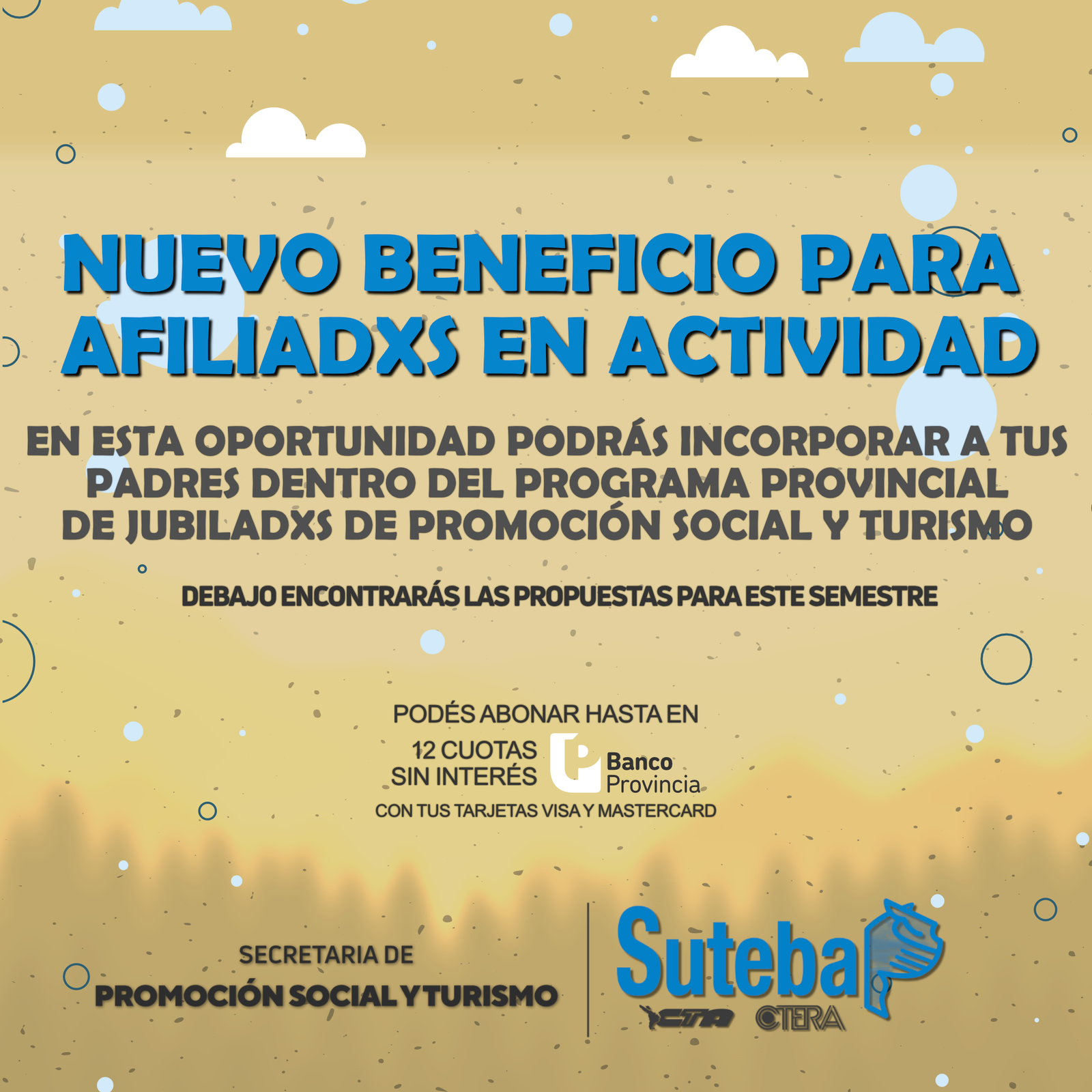 Desde el Suteba La Costa-Gral. Lavalle queremos contarte que tenés un nuevo beneficio como afiliadx en actividad: en esta oportunidad podés incorporar a tus padres dentro del programa provincial de Jubiladxs de Promoción Social y Turismo. La propuesta para este semestre es un viaje a la ciudad de San Rafael, Mendoza.
